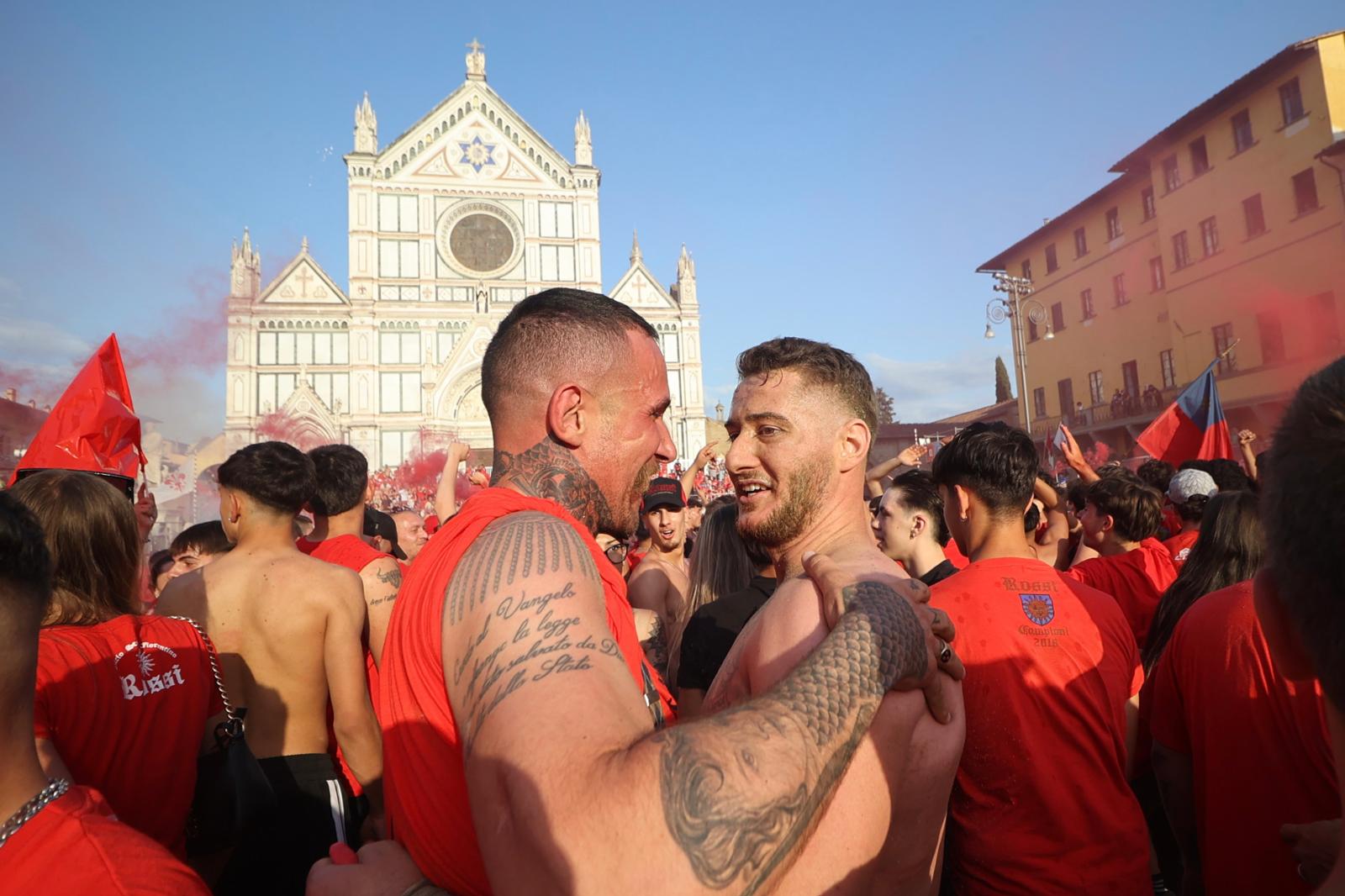 FIRENZE- Tenere il campo, possibilmente in superiorità numerica, regola aurea del Calcio storico. Stasera piazza Santa Croce lo ha confermato in una partita memorabile, conclusasi oltre il tempo regolamentare perché al termine della sfida Azzurri e Rossi stavano in parità 7-7. Ma sono gli uomini di Santa Maria Novella a portarsi a casa il palio perché l’ultima caccia è loro, il golden goal, che sul sabbione non si vedeva da un pezzo.