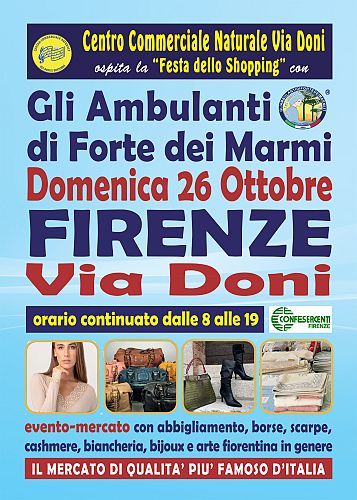 Si potranno infatti ammirare le ormai mitiche boutique a cielo aperto® dell’originale Consorzio domenica 26 ottobre lungo Via Doni. Dunque, un appuntamento da non perdere assolutamente per i tanti appassionati del genere, che lo hanno a lungo reclamato: una rassegna dello shopping più glamour e conveniente, con orario continuato, anche in caso di maltempo, dalle 8 alle 19.