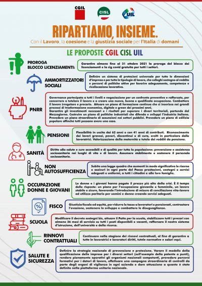 Firenze 25.06.2021.- “Ripartiamo Insieme: con il lavoro, la coesione e la giustizia sociale per l’Italia di domani”. È questo lo slogan scelto per la mobilitazione nazionale di Cgil, Cisl, Uil, che toccherà tre città: Firenze, Bari e Torino. Nel capoluogo toscano (ore 10 Piazza Santa Croce) le conclusioni saranno affidate al Segretario Generale Cisl Luigi Sbarra. In piazza saranno presenti anche i Segretari Generali di Cgil Toscana, Dalida Angelini, Cisl Toscana, Ciro Recce e Uil Toscana, Annalisa Nocentini.