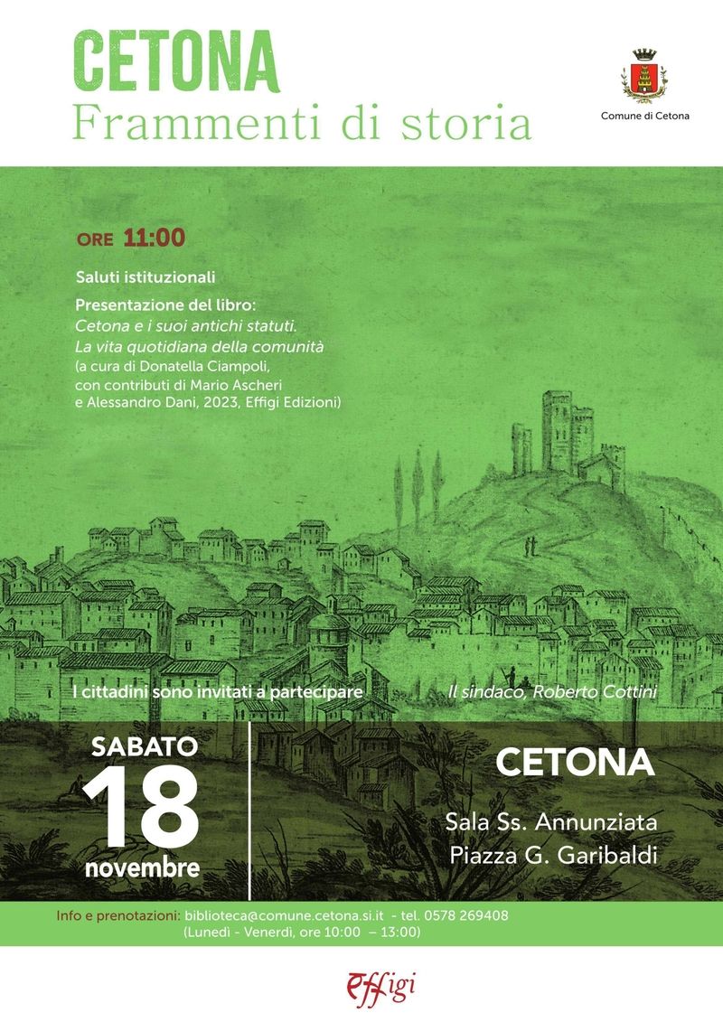 La comunità e la sua vita quotidiana”, a cura di Donatella Ciampoli, con la premessa di Mario Ascheri ed un saggio di Alessandro Dani (Effegi Edizioni, 2023), realizzato con il contributo del Comune di Cetona. Il libro sarà presentato a Cetona sabato 18 novembre 2023 alle ore 11.00, presso la Sala Ss. Annunziata, in Piazza G. Garibaldi, alla presenza del Sindaco Roberto Cottini. Per informazioni e prenotazioni Biblioteca comunale di Cetona (telefono 0578269408).