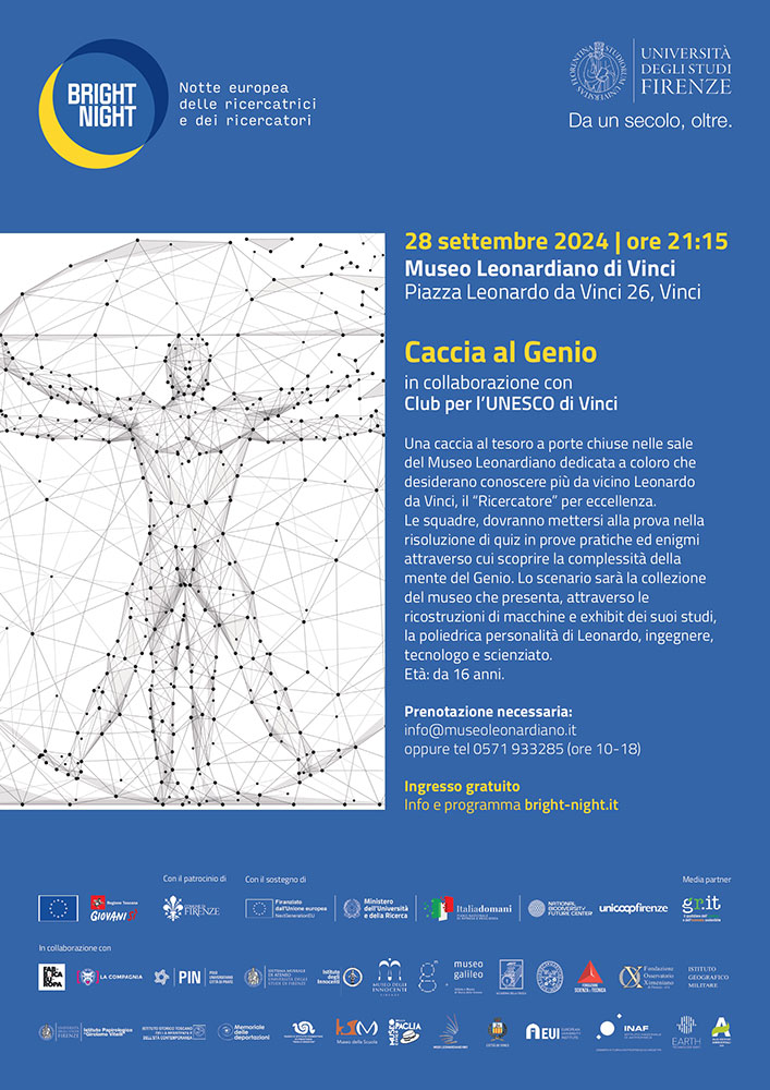Il Museo Leonardiano di Vinci parteciperà all'edizione 2024 della Bright Night, la notte europea delle ricercatrici e dei ricercatori, organizzata dall'Università degli Studi di Firenze allo scopo di diffondere e promuovere, attraverso una serie di attività, la cultura scientifica e l'impatto sociale della ricerca.