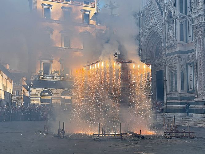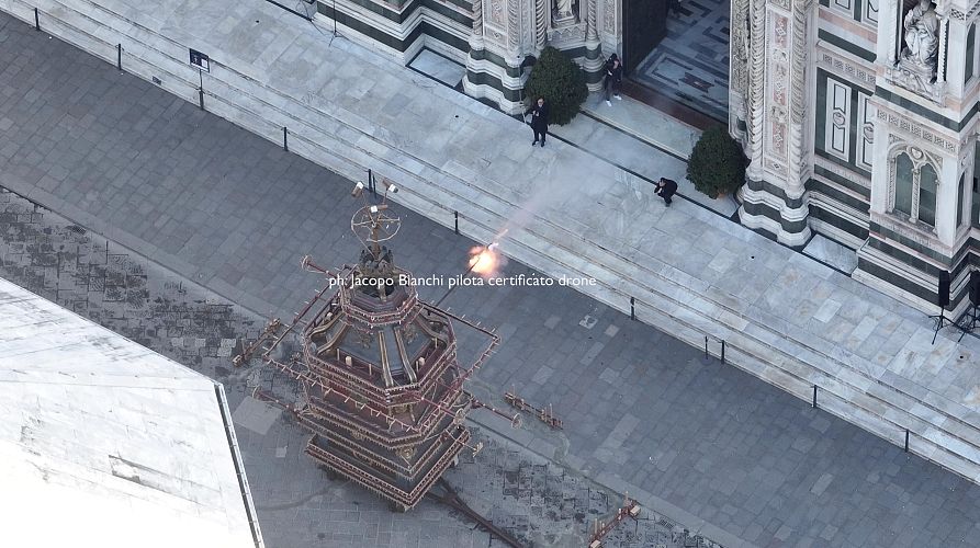 Nella mattinata di oggi, la cornice di Piazza del Duomo e della Cattedrale di Santa Maria del Fiore ha accolto il regolare svolgimento della cerimonia. Davanti a una comunità partecipe e silenziosa nel momento dell'attesa, la manifestazione ha seguito il suo antico protocollo, confermando l'efficienza di un apparato che fonde ingegno meccanico e devozione.