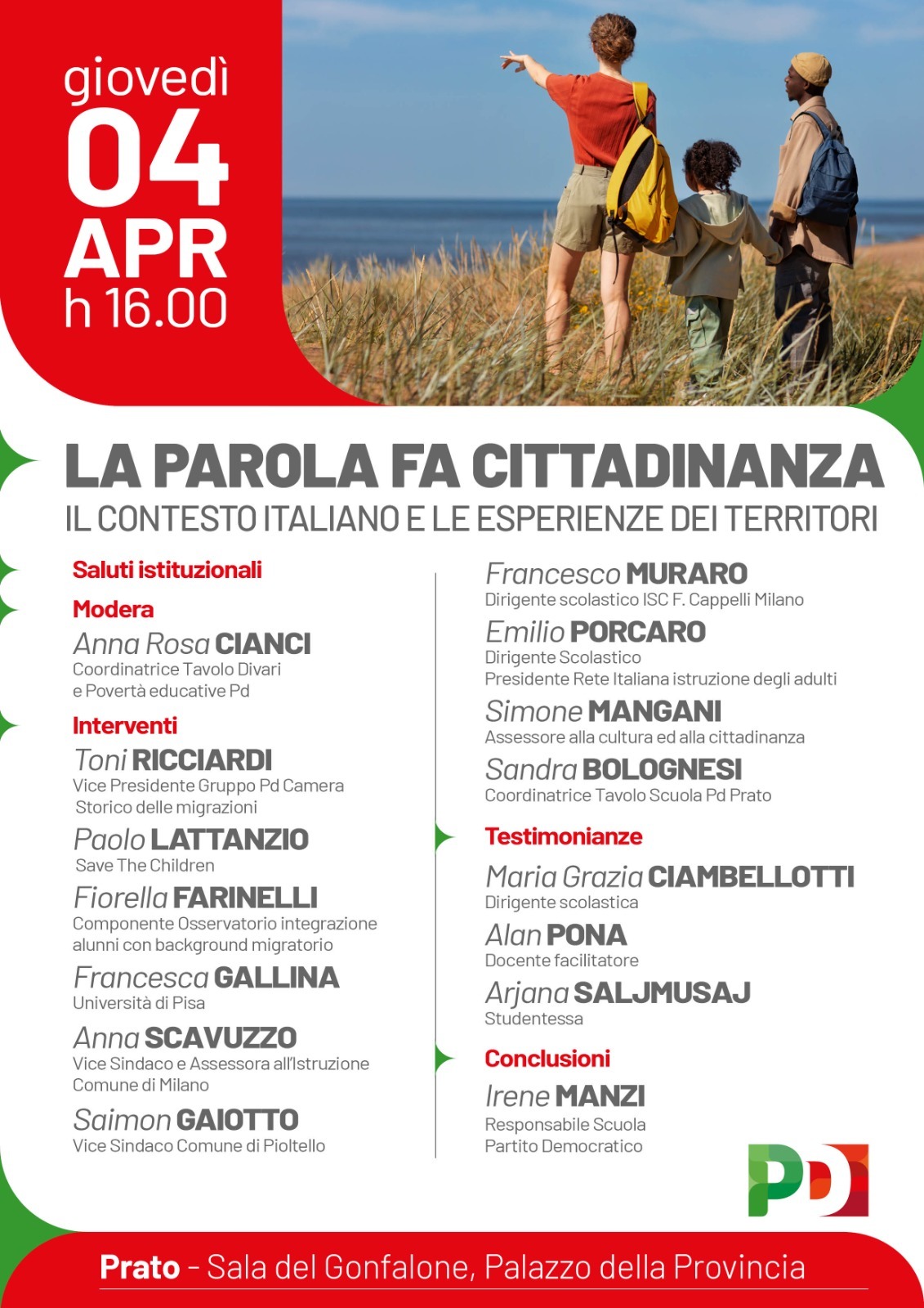 Giovedì 4 aprile si terrà a Prato “La parola fa cittadinanza”, iniziativa nazionale del Partito Democratico dedicata all’integrazione scolastica degli alunni stranieri. All’evento parteciperanno, tra gli altri, Anna Scavuzzo, vicesindaca di Milano, Paolo Lattanzio, Save The Children, Alessandra Nardini, assessora all’Istruzione della Regione Toscana, Toni Ricciardi, vicepresidente del gruppo PD alla Camera dei Deputati, Francesca Gallina, Università di Pisa, Christian Di Sanzo, deputato PD, Fiorella Farinelli, Osservatorio integrazione alunni con background migratorio.