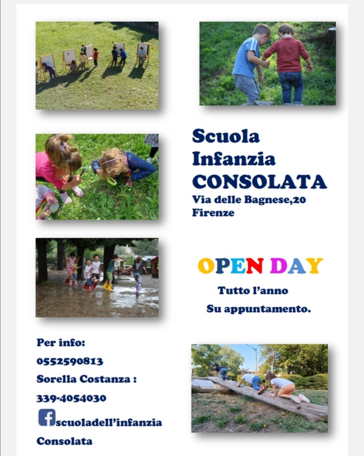 Open day tutto l'anno su appuntamento alla Scuola di Infanzia 3/6 anni della Consolata. L'indirizzo è via delle Bagnese 20, Firenze al confine con Scandicci.