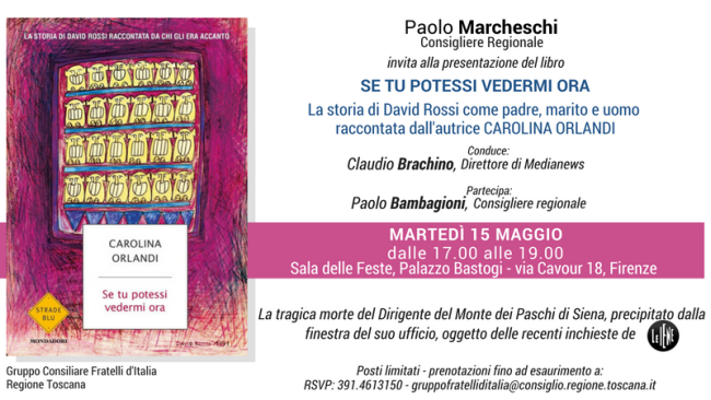 La presentazione del volume "Se tu potessi vedermi ora", la storia di David Rossi raccontata da chi gli era accanto, si terrà, domani, martedì 15 maggio, alle ore 17.00 presso Sala delle Feste, Palazzo Bastogi, in via Cavour 18, Firenze. A presentare il libro di Carolina Orlandi interverranno, oltre l'autrice: