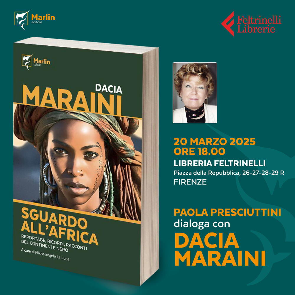 Il 20 marzo alle 18, presso gli spazi della libreria Feltrinelli di piazza della Repubblica a Firenze, si terrà la presentazione di “Sguardo all'Africa – Reportage, ricordi, racconti del continente nero” della scrittrice Dacia Maraini edito da Marlin nella collana La camera del fuoco. A cura di Michelangelo La Luna. Con questo libro si completa la trilogia di Dacia Maraini dedicata ai suoi viaggi in Asia (Sguardo a Oriente), in America (Sguardo al Nuovo Mondo) e in Africa. Con l'autrice dialogherà Paola Presciuttini.