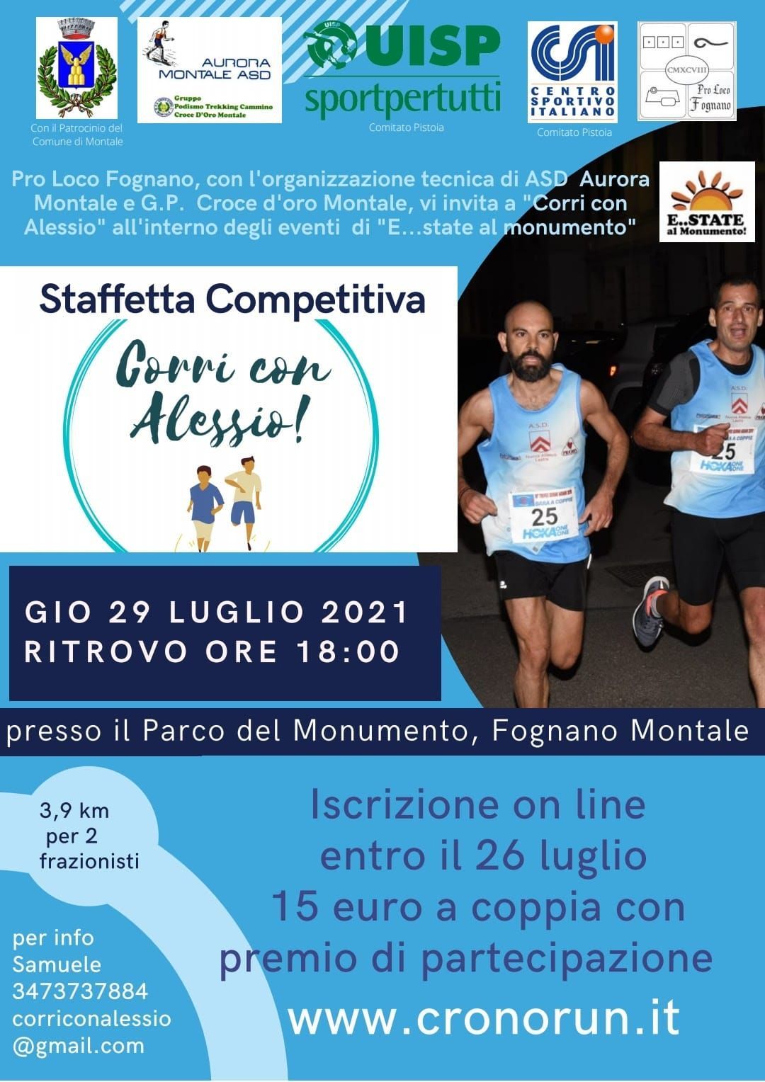 Altra manifestazione podistica per giovedì 29 luglio, organizzata dalla Pro Loco Fognano con l’organizzazione tecnica dell’Aurora Montale e Gruppo Podistico Croce Oro Montale ,una staffetta a carattere competitivo denominata Corri con Alessio per ricordare Alessio Torracchi recentemente scomparso. Il Ritrovo della gara e presso il Parco del Monumento a Fognano alle ore 18 ,da dove prenderà il via anche la gara. La quota iscrizione alla gara e di euro 15 a coppia le iscrizioni dovranno essere fatto al portale WWW CRNORUN. Il percorso della gara e di km 3,900 che ogni frazionista dovrà percorrere, per informazioni sulla gara potete telefonare al numero 3473737884.