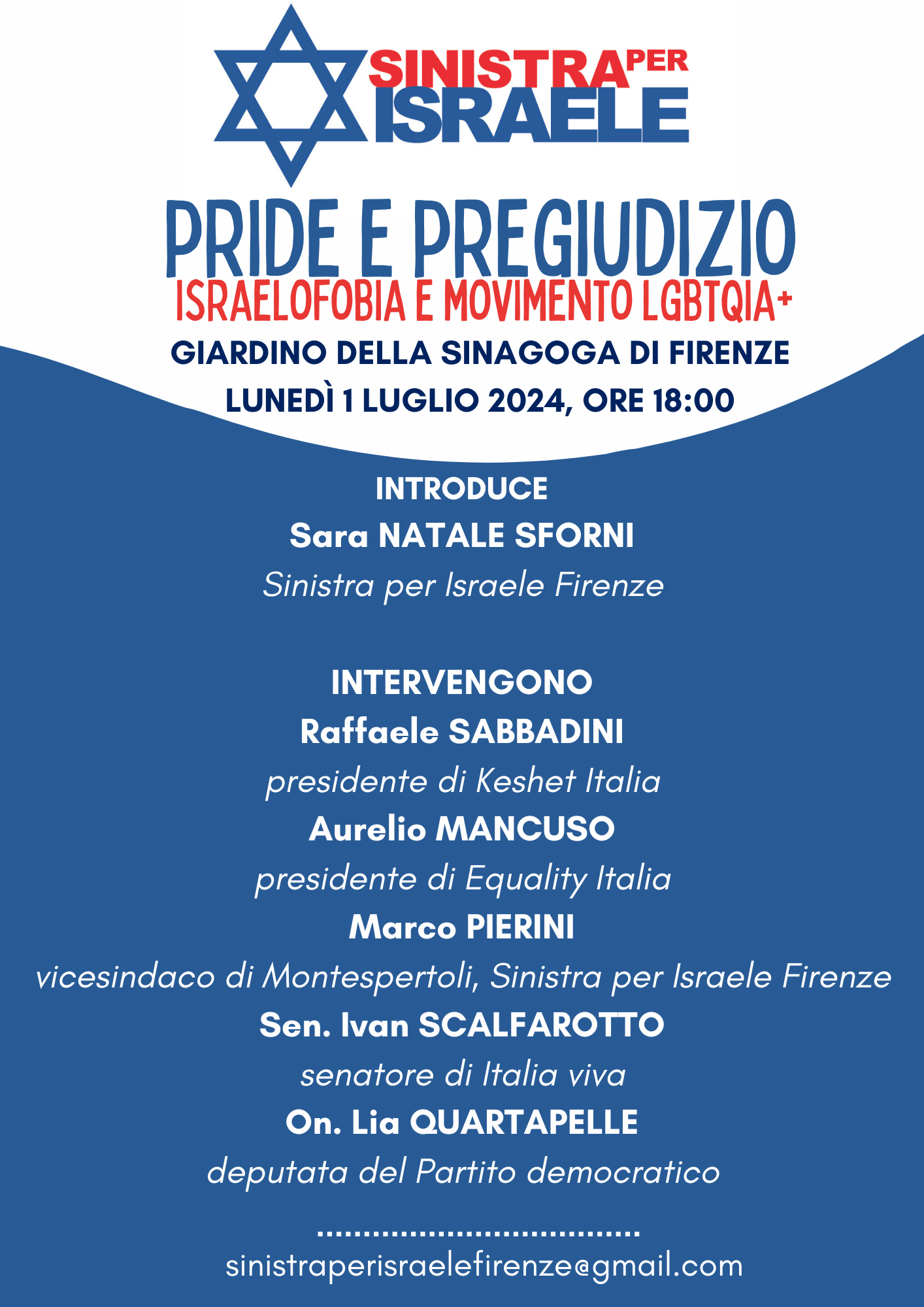 È in questo contesto che il 1 luglio 2024 alle ore 18:00 la sezione fiorentina di Sinistra per Israele promuove presso il giardino della sinagoga di Firenze in via Farini un incontro pubblico dal titolo “Pride e pregiudizio. Israelofobia e movimento LGBTQIA+”, che si propone di dare rilievo al divieto di sventolare bandiere israeliane deciso dagli organizzatori di vari Pride italiani (tra cui quello di Bergamo, in cui sono state definite “non gradite, né tollerate” anche quelle “inneggianti alla simbologia connessa allo stato di Israele”). Tale divieto ha portato all’assenza dai cortei dell’associazione ebraica LGBTQIA+ Keshet Italia, il cui vessillo è una bandiera arcobaleno con al centro una stella di David.