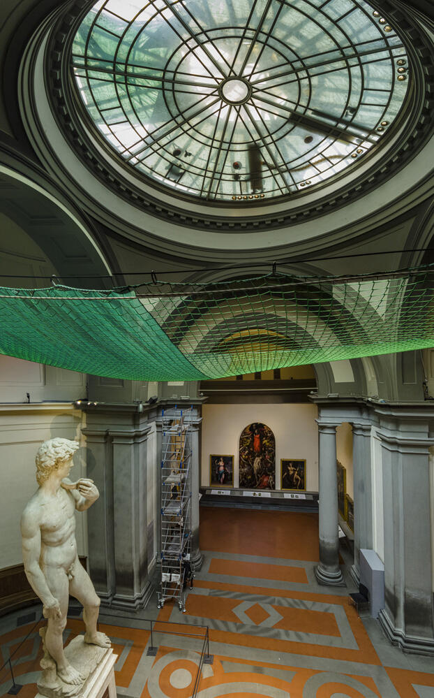 Il cantiere si è svolto per circa sette settimane, nei giorni di chiusura al pubblico del museo, e ha visto all’opera due ditte specializzate che si sono alternate nella realizzazione dei lavori. La prima, ogni domenica sera, nel momento in cui la Galleria chiude le porte e le sue sale si svuotano, si è adoperata per montare una grande rete destinata a proteggere la scultura del David sottostante; l’altra, ogni lunedì, è salita sul lucernario per consolidarne la struttura, lavorando in piena sicurezza grazie all'installazione di un’apposita linea vita. Prima della riapertura al pubblico il martedì, la rete è stata ogni volta parzialmente smontata, per consentire la piena visibilità del capolavoro di Michelangelo senza la struttura invasiva, che tuttavia è stata sicuramente notata dai visitatori in questi ultimi due mesi.