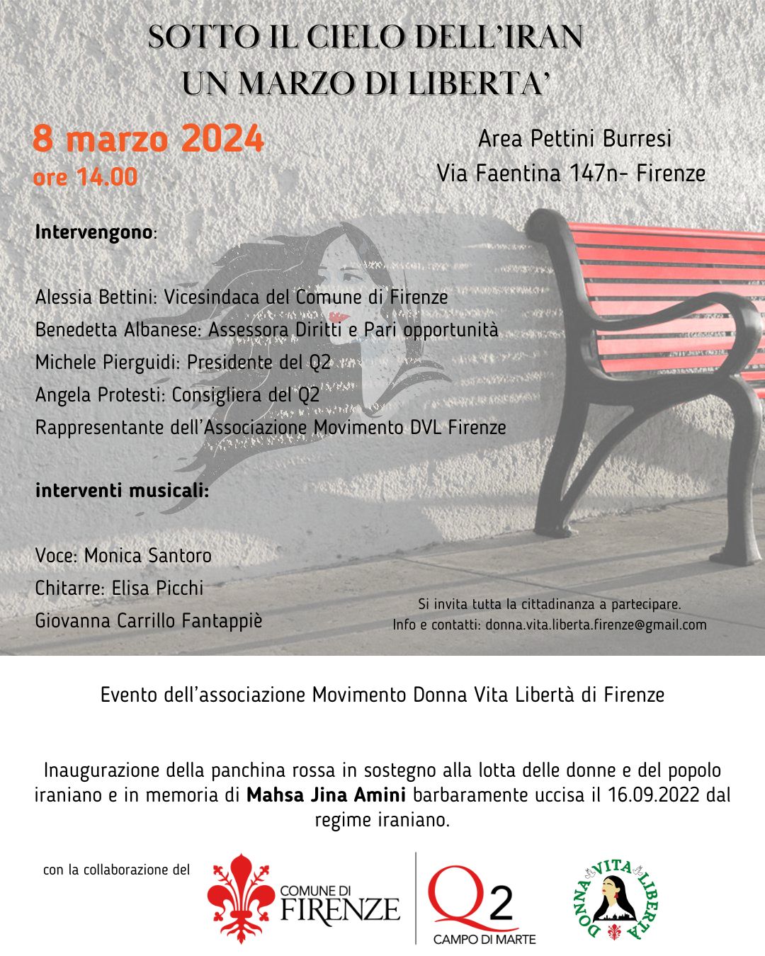 Venerdì 8 Marzo alle ore 14.00, all'Area Pettini Burresi, in occasione della Festa della Donna, si terrà l'inaugurazione della panchina rossa in sostegno alla lotta delle donne e del popolo iraniano e in memoria di Mahsa Jina Amini, barbaramente uccisa il 19 Settembre 2022 dal regime iraniano.