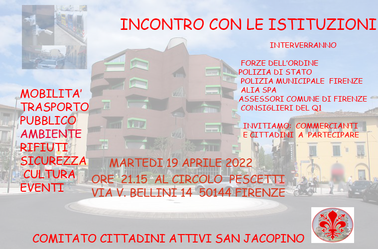 Martedì 19 aprile alle ore 21.15, in via Vincenzo Bellini 14, il “Comitato Cittadini Attivi San Jacopino”, da tempo impegnati in un costruttivo progetto di difesa e valorizzazione del tessuto urbano nel quale vivono, promuove un incontro pubblico alla presenza delle istituzioni preposte che è divenuto un appuntamento annuale, voluto dalla cittadinanza, nell’ambito di un percorso collaborativo che mira alla soluzione delle problematiche esistenti.