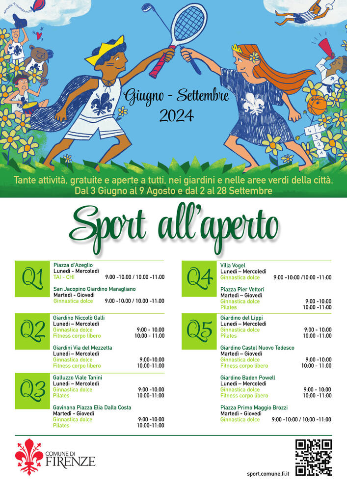 Nel Quartiere 5 al giardino del Lippi ginnastica dolce lunedì e mercoledì dalle 9 alle 10 e pilates dalle 10 alle 11, al giardino Castelnuovo Tedesco ginnastica dolce martedì e giovedì dalle 9 alle 10 e e fitness corpo libero dalle 10 alle 11, al giardino Baden Powell, ginnastica dolce lunedì e mercoledì alle 9 alle 10 e e fitness corpo libero dalle 10 alle 11. In piazza Primo Maggio, infine, ginnastica dolce martedì e giovedì dalle 9 alle 10 e dalle 10 alle 11.