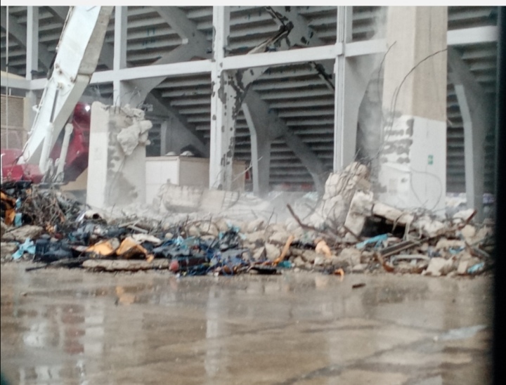 FOTOGRAFIE - Proseguono i lavori in zona Curva Ferrovia dello stadio Franchi di Firenze. Oggi pomeriggio con un mezzo meccanico veniva buttata giù una delle colonne di cemento armato che sorreggevano il tabellone per la pubblicità, già distrutto. Sono interventi di demolizione propedeutica. Entro marzo dovrebbe essere distrutto il tabellone più grosso, quello segnapunti realizzato in occasione di Italia 90.