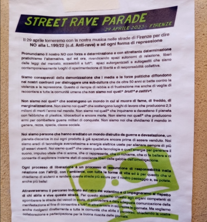 Dopo varie città italiane, sabato prossimo 29 aprile tocca a Firenze ospitare la manifestazione del popolo del rave che protesta contro la Legge. 199/22 (cosiddetta "Anti rave").Il corteo fiorentino è pubblicizzato attraverso alcuni volantini proprio nella zona di passaggio, ad esempio piazza San Felice e piazza Pitti.