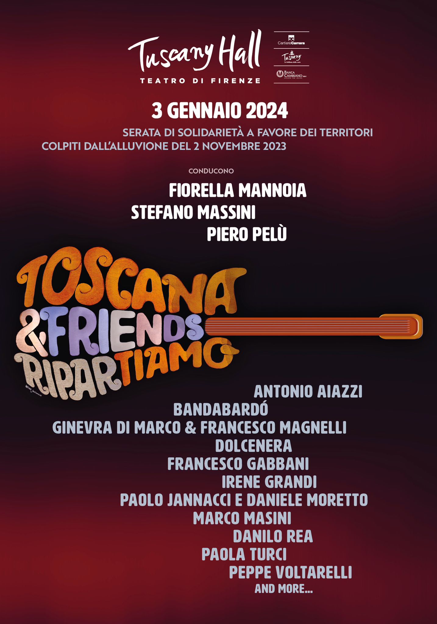 Antonio Aiazzi, Bandabardò, Ginevra Di Marco & Francesco Magnelli, Dolcenera, Francesco Gabbani, Irene Grandi, Paolo Jannacci con Daniele Moretto, Marco Masini, Danilo Rea, Paola Turci, Peppe Voltarelli: sono gli artisti dal cuore grande che saranno sul palco del Tuscany Hall di Firenze, mercoledì 3 gennaio, per “Toscana and friends. Ripartiamo”, la serata evento ideata e condotta da Fiorella Mannoia, Stefano Massini e Piero Pelù per raccogliere fondi a sostegno delle popolazioni della Toscana colpite dall’alluvione dello scorso novembre.