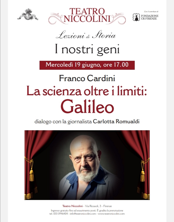 Firenze, 17 giugno 2024 – Sarà Franco Cardini l’ospite dell’incontro di mercoledì 19 giugno alle 17.00 al Teatro Niccolini. Lo storico dialogherà con la giornalista Carlotta Romualdi sul tema “La scienza oltre ai limiti: Galileo”. Come per gli altri appuntamenti del ciclo Lezioni di Storia, l’ingresso è gratuito. È gradita la prenotazione: 055 0946404 - info@teatroniccolini.com.