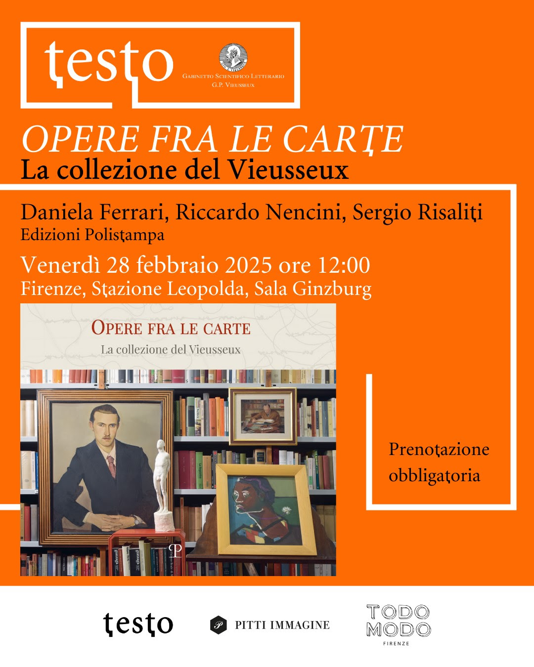 Renato Guttuso, Eugenio Montale, Pier Paolo Pasolini: sono alcuni dei nomi di spicco nella collezione di dipinti, grafiche e sculture custodita dal Gabinetto Scientifico Letterario G.P. Vieusseux. A questo prezioso patrimonio artistico è dedicato il catalogo Opere fra le carte. La collezione del Vieusseux. Il volume illustrato, edito da Polistampa, sarà presentato al pubblico venerdì 28 febbraio alle 12.00 alla Sala Ginzburg. Saranno presenti la curatrice Daniela Ferrari, il presidente del Vieusseux Riccardo Nencini e il direttore del Museo Novecento Sergio Risaliti. L’ingresso è su prenotazione tramite il sito ufficiale della manifestazione.