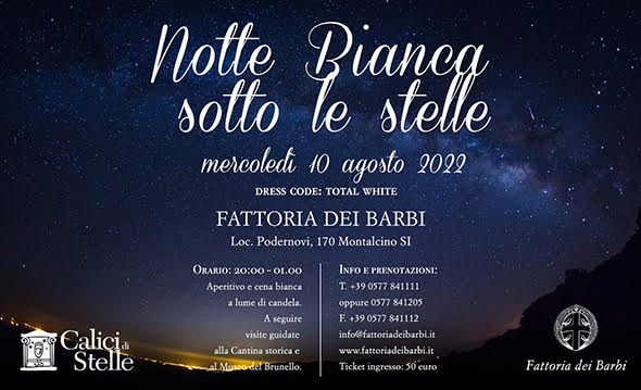 Vino, visite itineranti e una cena in total white a lume di candela sotto il firmamento. Torna mercoledì 10 agosto 2022 la Notte Bianca alla Fattoria dei Barbi, l’evento serale – e su prenotazione – dedicato agli amanti del vino e degli astri, organizzato in occasione dell’iniziativa nazionale Calici di Stelle del Movimento turismo del vino. Appuntamento alle 20:00 per aperitivo e cena placée all’aperto a lume di candela, con dress code rigorosamente bianco, sia per gli ospiti che per il menù.