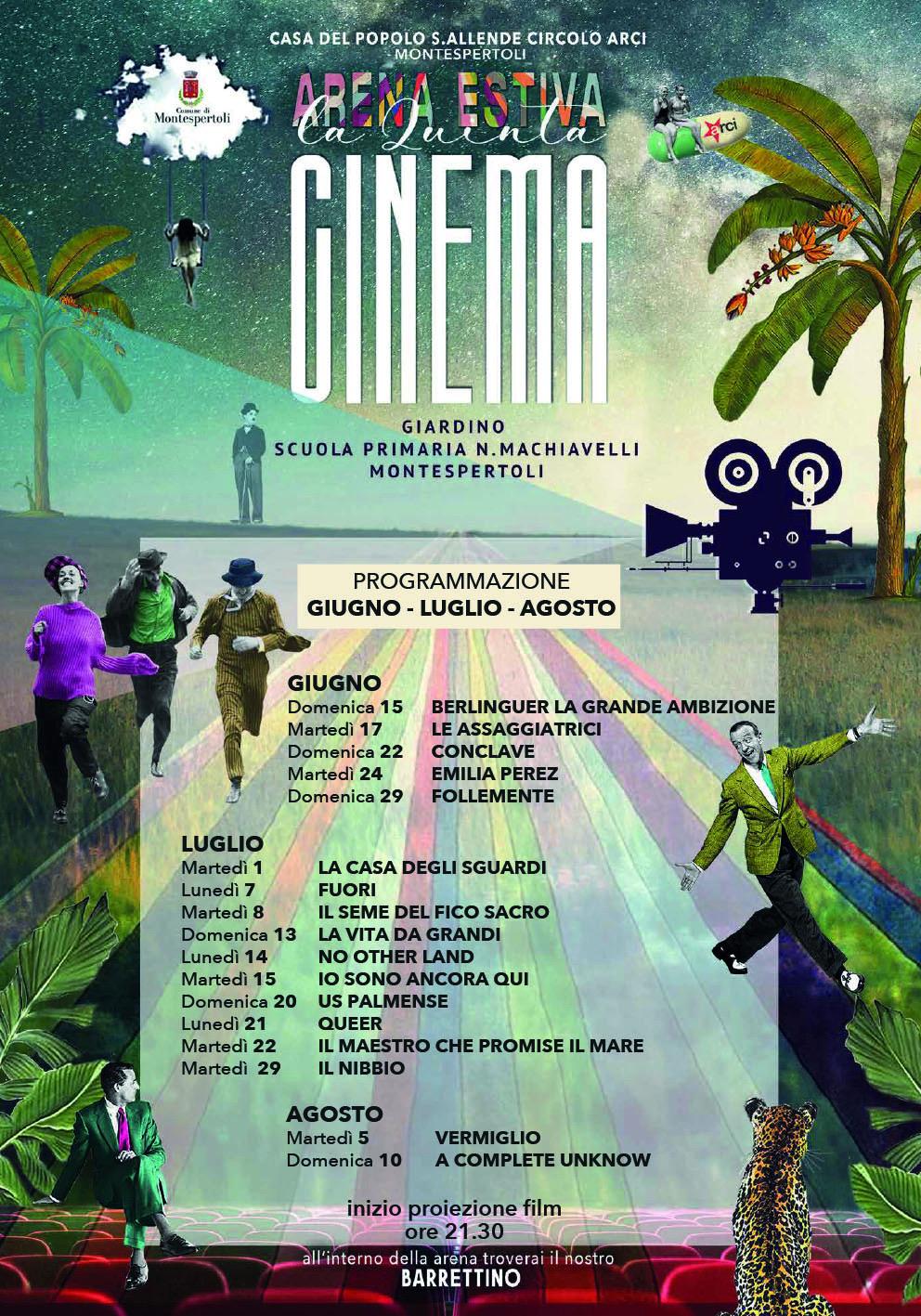 La rassegna cinematografica, curata dalla Casa del Popolo S. Allende Circolo ARCI Montespertoli, propone una ricca selezione di titoli italiani e internazionali, spaziando tra film d’autore, novità e successi di critica, con un’attenzione particolare ai temi sociali, ai grandi registi e al cinema che sa far pensare. Il programma si snoda nei mesi di giugno, luglio e agosto con proiezioni ogni settimana il martedì e la domenica. Tra i titoli in cartellone: Berlin – La grande ambizione, Emilia Perez, Il seme del fico sacro, Il maestro che promise il mare, Il Nibbio, Vermiglio, A complete unknown e molti altri. Le proiezioni iniziano alle ore 21.30.