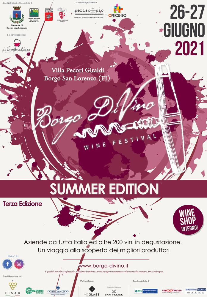 Si avvicina l’appuntamento con il Wine Festival “Borgo Divino” che dopo il successo delle prime due edizioni e la versione on line in tempo di pandemia, a ottobre 2020, presenta la sua prima edizione estiva tornando a Villa Pecori Giraldi a Borgo San Lorenzo.