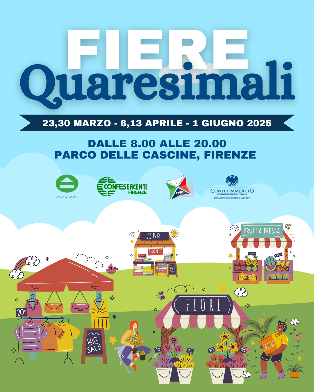 Tornano, al Parco delle Cascine di Firenze, gli appuntamenti con le quattro domeniche di Fiere Quaresimali (23 e 30 marzo, 6 e 13 aprile 2025) e con la Fiera dell'Ascensione (1° giugno 2025). Oltre 200 stand per un percorso espositivo di 1,5 km, con l’organizzazione di Confcommercio e Confesercenti.