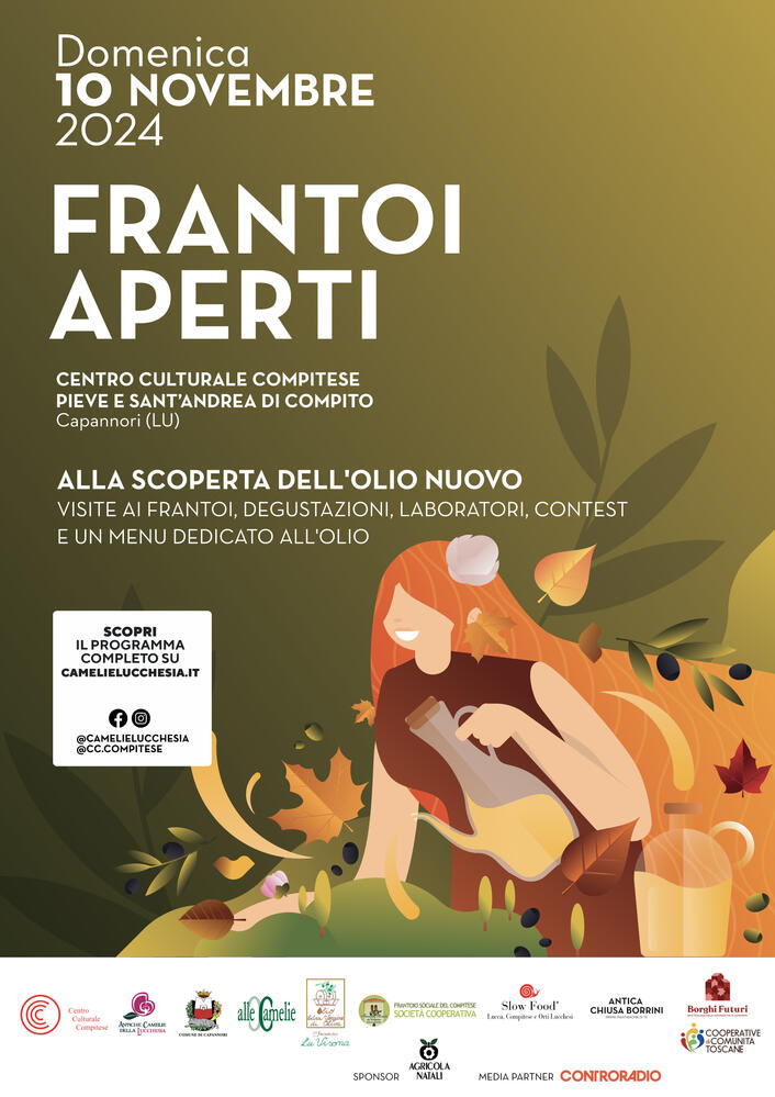Sempre domenica mattina (dalle ore 9.30 alle 12.30) sarà possibile visitare anche il Frantoio sociale del Compitese, in via di Tiglio 609A, accompagnati da Emiliano Pardini, esperto in olivicoltura e frantoiano. Sarà possibile acquistare l'olio nuovo dei frantoi locali.Grazie alla collaborazione con "Slow Food Lucca, Compitese e Orti Lucchesi" sarà possibile partecipare gratuitamente alla degustazione "Olio Extravergine di oliva, nutrizione e cucina" (Centro Culturale Compitese, ore 11.30).