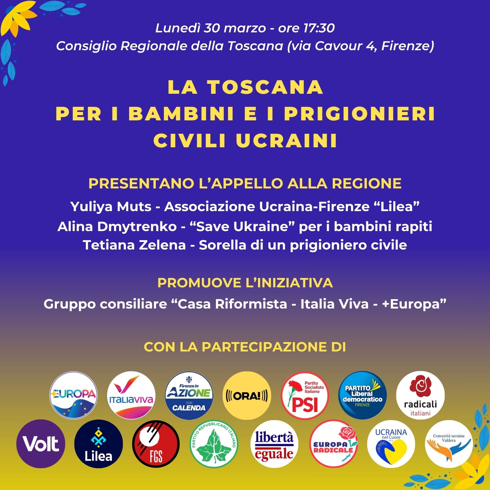 All'iniziativa porteranno il proprio sostegno anche il senatore di Italia viva Ivan Scalfarotto e il deputato e segretario di Più Europa Riccardo Magi, e i rappresentanti delle forze politiche promotrici, che interverranno sul tema dell'appello e delle azioni concrete di sostegno alla popolazione ucraina.L'incontro vuole essere un momento di sensibilizzazione e partecipazione, volto a rafforzare la consapevolezza sul dramma dei bambini e dei prigionieri civili ucraini e a promuovere iniziative concrete di tutela e sostegno da parte delle istituzioni.