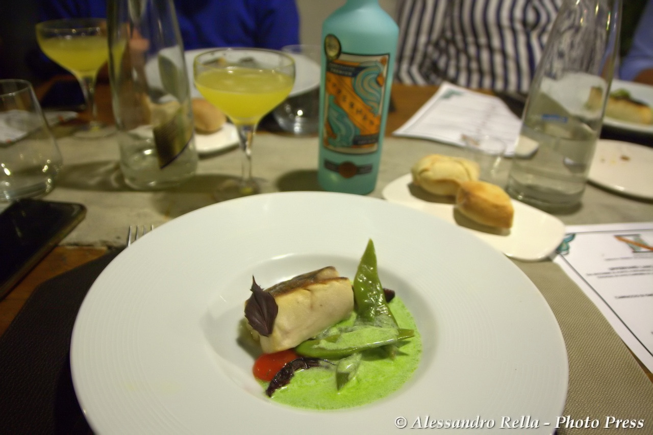E ancora, il Pescato del giorno cotto alla coque, insalata di taccole e susine con fit servito con panna acida al ginepro in abbinamento al cocktail “Uh,Gimlet!”.