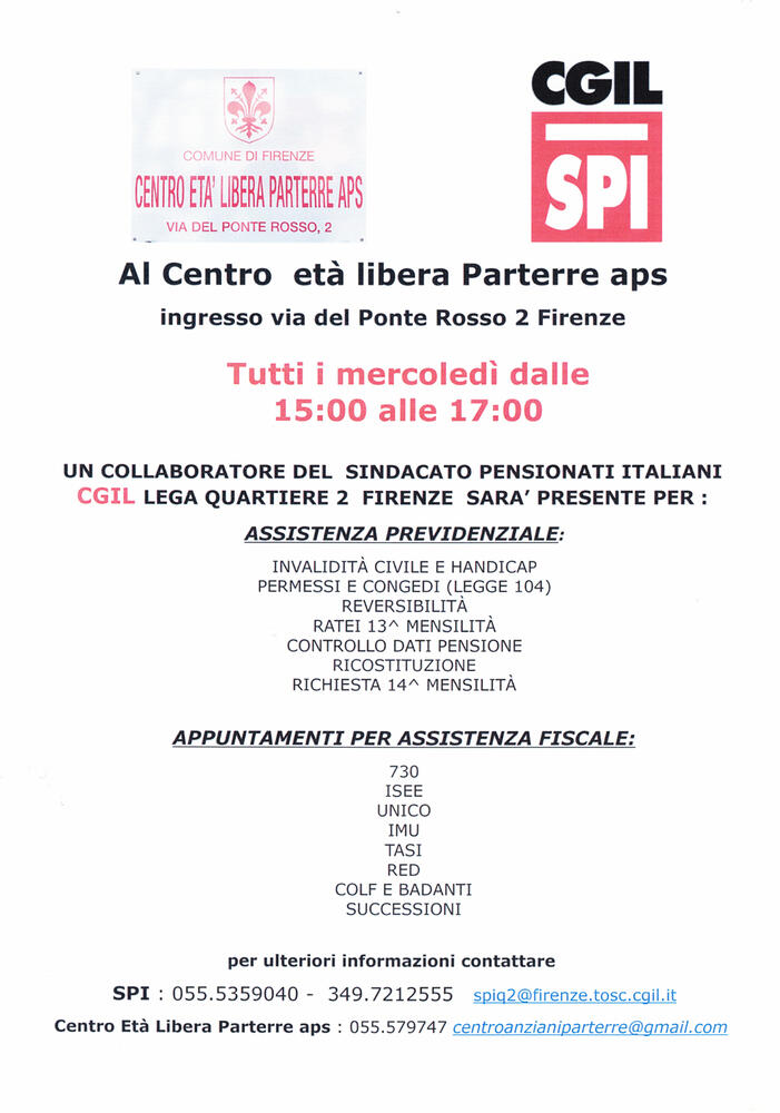 Al Centro Età Libera Parterre aps, con sede in via del Ponte Rosso 2 Firenze, è stato costituito uno sportello di assistenza amministrativa in collaborazione con lo SPI-CGIL, per assistere gratuitamente i nostri pensionati per tutti gli aspetti previdenziali ed assistenza fiscale.