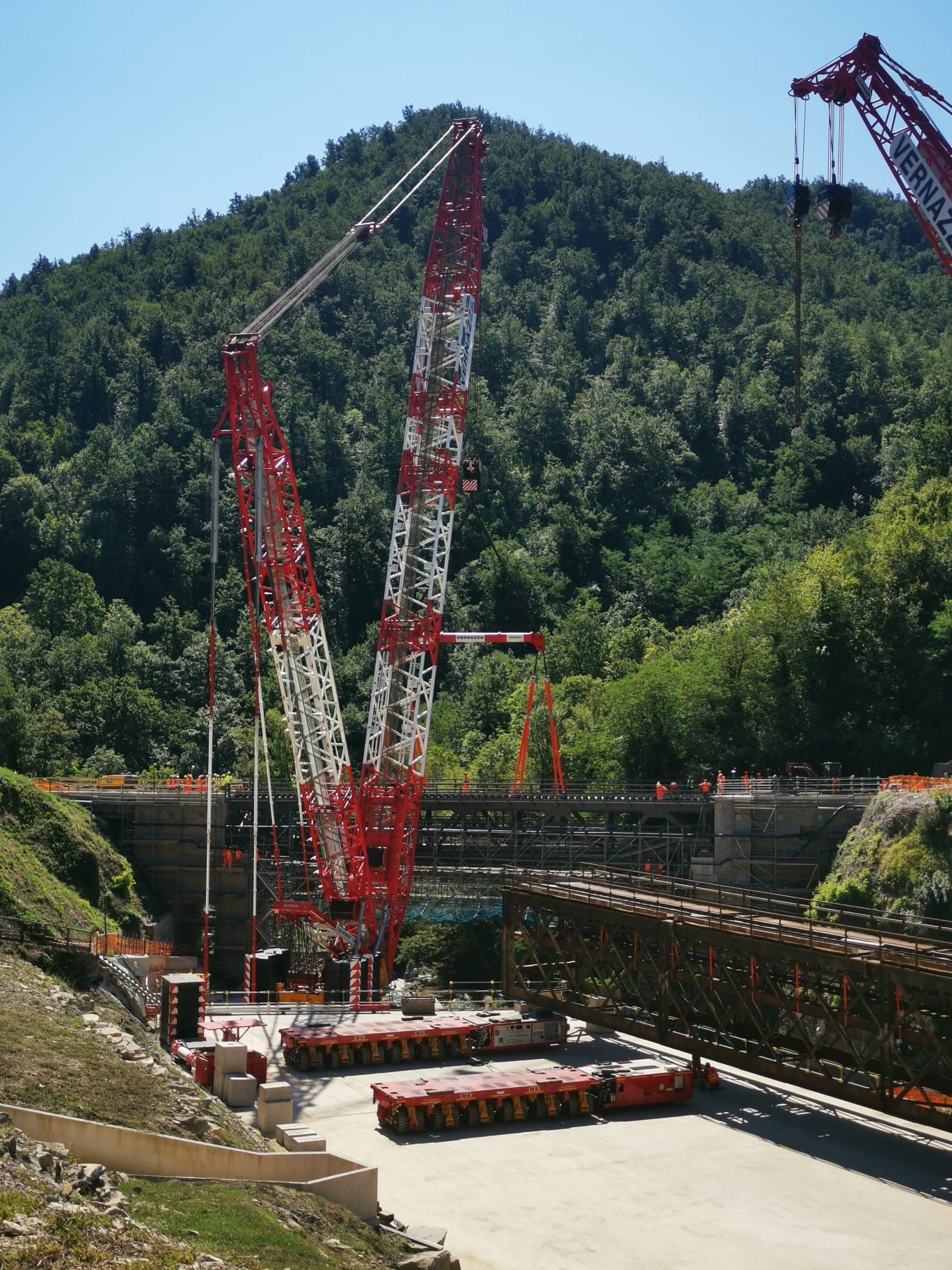Circa 50 i tecnici di RFI e delle imprese appaltatrici al lavoro nel cantiere, coadiuvati da vari mezzi d’opera. Per la rimozione della vecchia travata e il posizionamento della nuova è stata impiegata una gru alta oltre 30 metri e della portata di 700 tonnellate. I componenti della gru sono stati portati nell’area di cantiere con vari trasporti eccezionali e sono stati assemblati sul posto con l’ausilio di una seconda gru. Per consentire questa attività è stata realizzata un’area di cantiere su due livelli: uno superiore per la gru di supporto e per il deposito della nuova e della vecchia travata e uno inferiore per la gru utilizzata per movimentare le travate.