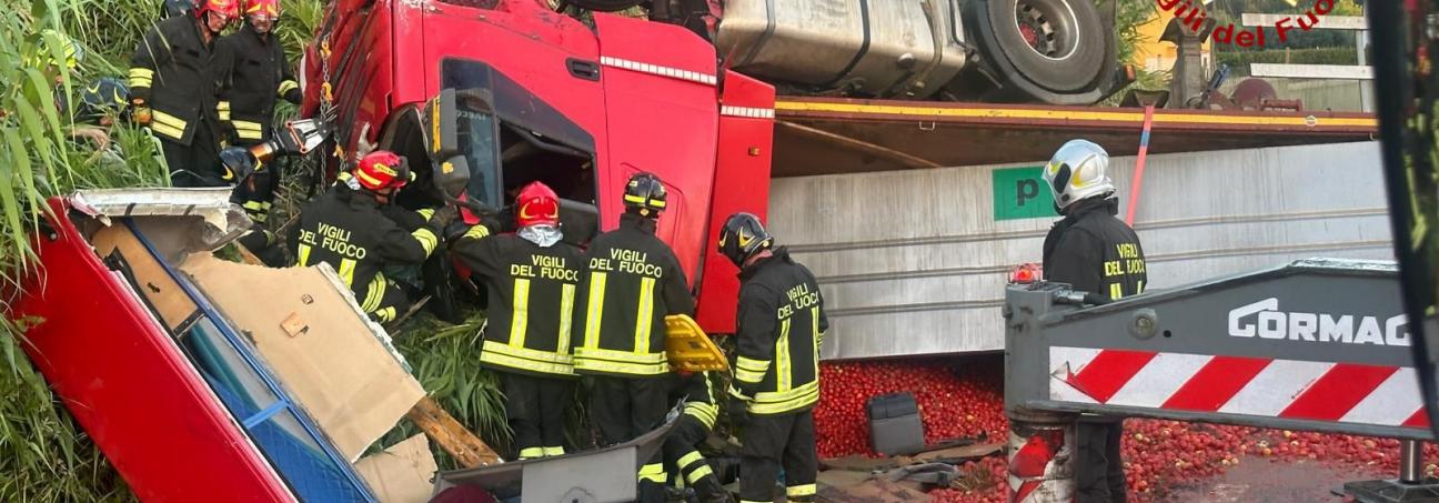 Le squadre del distaccamento di Orbetello, della sede centrale di Grosseto ed il funzionario tecnico, sono intervenuti nel pomeriggio di ieri, sulla SS1 Aurelia all’altezza dello svincolo per Orbetello, per un incidente stradale dove erano coinvolti un’auto ed un autotreno. Nello scontro l’autovettura con a bordo due persone ha terminato la sua corsa fuori strada, mentre il mezzo pesante, trasportante pomodori, si è ribaltato sulla carreggiata spargendo tutto il carico su entrambe le corsie in direzione nord e con la cabina di guida nella fossetta laterale.