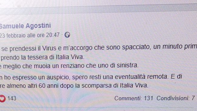 Intervengono a questo proposito anche Titta Meucci e Stefano Scaramelli, consiglieri regionali toscani di Italia Viva: “Quando il 23 febbraio abbiamo letto il post in cui Samuele Agostini augurava di fatto sia la morte dei renziani che di Italia Viva, abbiamo sperato che l’autore si rendesse conto di ciò che aveva scritto e lo cancellasse. Eppure, a tre giorni di distanza, le sue parole campeggiano ancora in tutta la loro delirante oscenità. Il fatto che Agostini non abbia avuto – continuano Scaramelli e Meucci - la decenza e il buonsenso di cancellare il post rivela che non si trattava di una provocazione di cattivo gusto sfuggita di mano ma di un atteggiamento consapevole e consolidato.