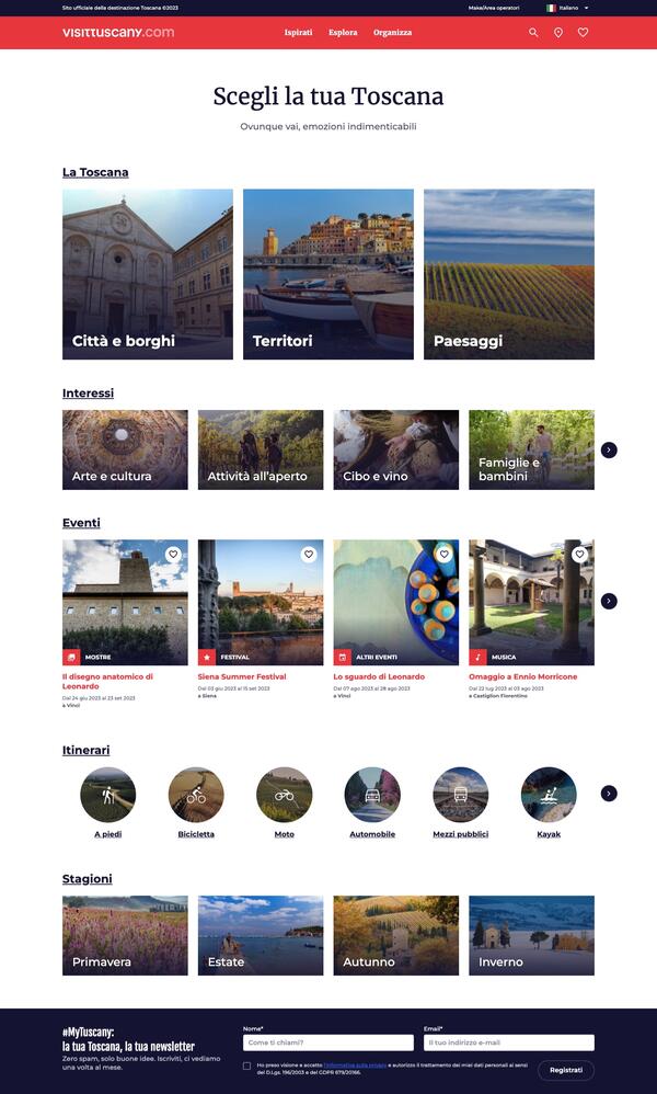 A 5 anni dalla sua messa online, visittuscany.com, il sito ufficiale della destinazione Toscana gestito per conto della Regione da Fondazione Sistema Toscana, fa un ulteriore passo avanti: nuova esperienza di navigazione, rinnovato design e incrementati livelli di accessibilità.